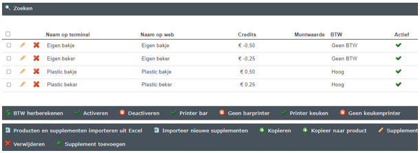 Stap 4. Maak eventueel hetzelfde nogmaals aan voor een eigen meegenomen bakje. In de beheeromgeving ziet je supplementenpagina er als volgt uit: