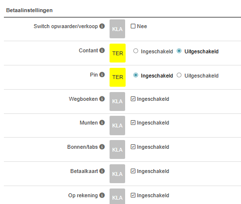 Stap 2. Onder 'Betaalinstellingen' klik je op het grijze vierkantje met de tekst 'KLA'. Hierdoor veranderd het grijze vierkantje in een geel vierkantje met de tekst 'TER' en verschijnen de in- en uitschakel mogelijkheden.