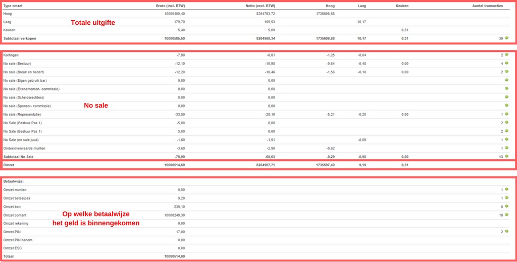 - De Credits uitgesplitst toont de totale omzet inclusief No-sale ‘Totale uitgifte’. Vervolgens gaat daar de ‘no-sale’ vanaf, tegen verkoopwaarde, zodat alleen de daadwerkelijk betaalde omzet nog overblijft. Dit is ook de omzet waarover btw moet worden betaald.