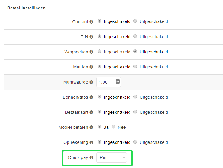 Let op: wij adviseren om de contant knop NIET als Quick pay in te stellen.