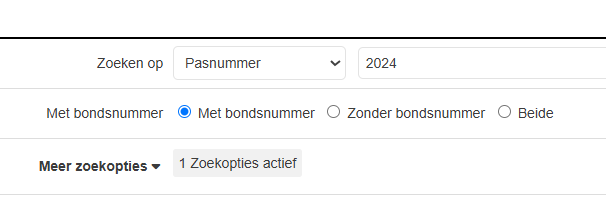 Stap 3. Kies in de filter achter 'Zoeken op - Pasnummer en vul daarachter in het invulveld 2024 in. Selecteer het vakje achter 'Met bondsnummer'. Zo worden alleen de KNLTB-passen opgezocht. Klik vervolgens op 'Zoeken'.