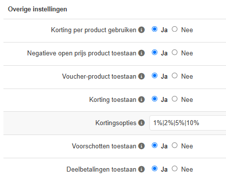 Bij 'Overige instellingen' kan je een aantal functionaliteiten activeren. Hier zie je de optie 'Voorschotten toestaan' en 'Deelbetalingen toestaan'. Staat deze nog op 'Nee' zet deze op 'Ja' en druk onderaan op 'Opslaan'.