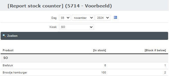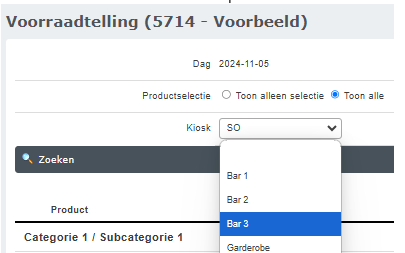 Ga naar Productbeheer > Voorraadtelling rapport en selecteer de dag en de kiosk waarvan je de rapportage wilt zien. Het is enkel mogelijk om een dagrapportage te zien.