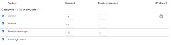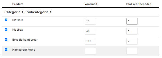 Het is mogelijk om producten uit en aan te vinken. Ieder product waar het vinkje aan staat betekent dat de voorraad is ingesteld. Als het uitgevinkt is wordt de voorraad niet bijgehouden en worden na het opslaan de kolommen geleegd.