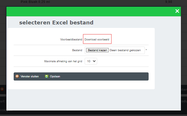 Stap 4. Je kan aan de hand van het voorbeeldbestand in Excel de gewenste producten invullen. Heb je alles ingevuld? Dan kan je het bestand via dezelfde wijze uploaden.