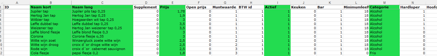 - Kolom I Actief: bepaalt of het product verkocht kan worden of niet: 1 = actief, 0 = niet actief.