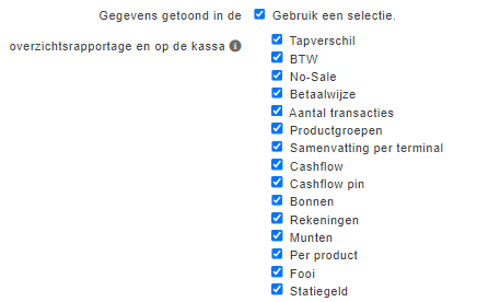Stap 1. Om het tapverschil ook op de kassa in te zien, ga je naar de pagina Klantinstellingen > Instellingen en zoek je naar de instelling 'Gegevens getoond in de overzichtsrapportage en op de kassa'.